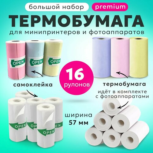 Бумага премиум для фотоаппарата, мини-принтера 57 мм 5рул + 5рул самоклеящаяся + 3рул цветная + 3рул цветная самоклеящаяся