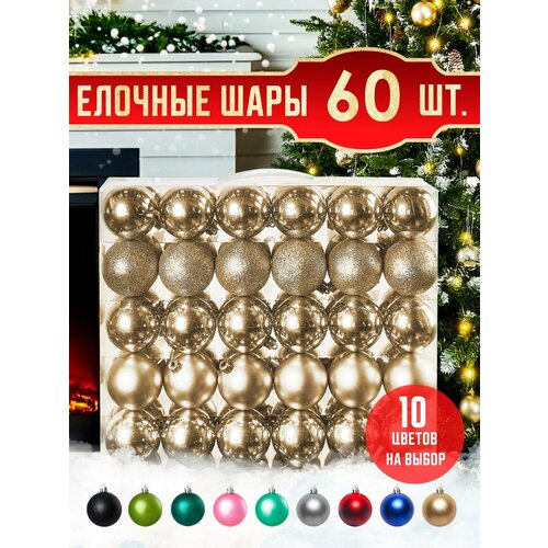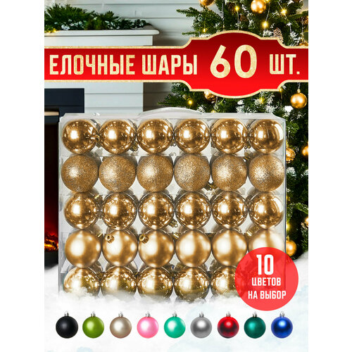 Новогодние елочные игрушки шары на елку Набор шаров 60 шт Подвесные пластиковые маленькие шарики на ель комплект Елочное украшение на Новый год