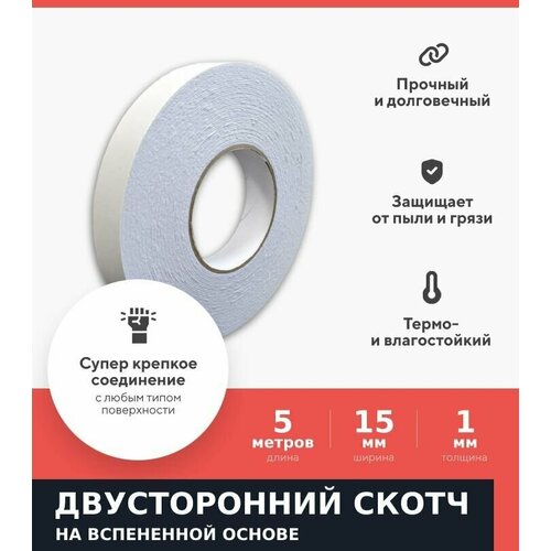Двусторонняя клейкая лента на вспененной основе Kraftcom, 15мм х 5м, 1000мкм, (1шт) / полипропиленовый скотч / надежное крепление