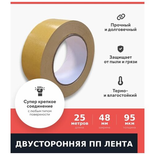 Двусторонняя клейкая лента на ПП основе Kraftcom, 48мм х 25м, 95 мкм (1шт) / полипропиленовый скотч / надежное крепление