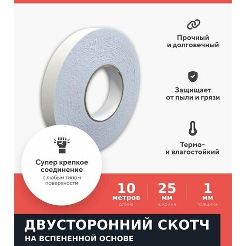 Двусторонняя клейкая лента на вспененной основе Kraftcom, 25мм х 10м, 1000мкм, (1шт) / полипропиленовый скотч / надежное крепление