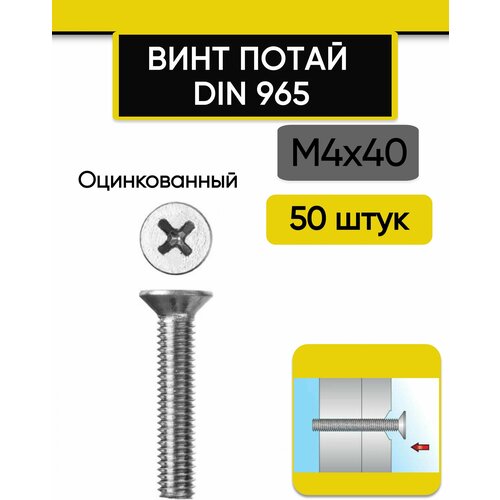 Винт потай М4х40 мм, 50 шт. DIN 965, оцинкованный, стальной, шлиц Ph.