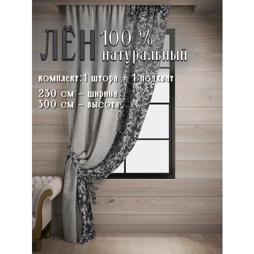 Натуральные льняные шторы, лен 100%, ширина 230, высота 300, с подхватом, левая, серый вензель