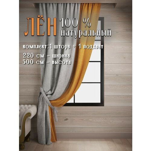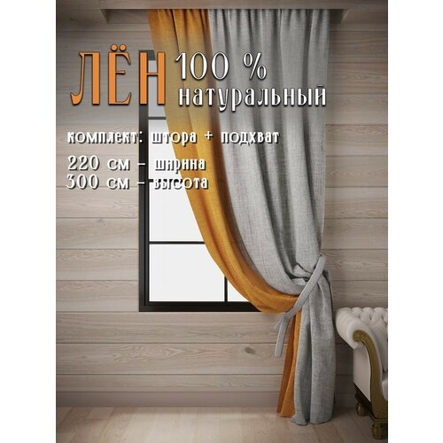 Натуральные льняные шторы, лен 100%, ширина 220, высота 300, с подхватом, левая, серый/горчичный