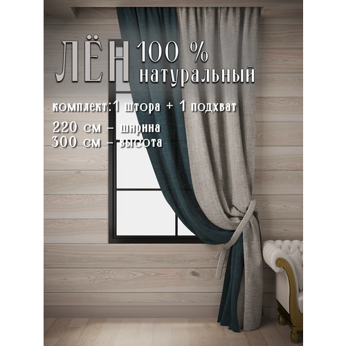 Натуральные льняные шторы, лен 100%, ширина 220, высота 300, с подхватом, левая, серый/бирюзовый