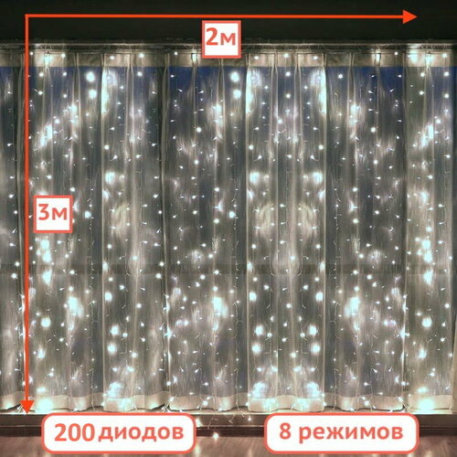 Гирлянда внутренняя занавес штора 200, 2*3 метра, коннектор, белый