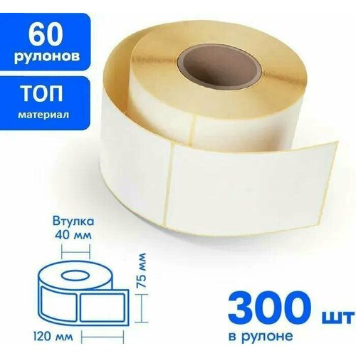 Термоэтикетка ТОП, 75 х 120 мм, 60 рулонов по 300 этикеток (18000 шт в комплекте), втулка 40 мм