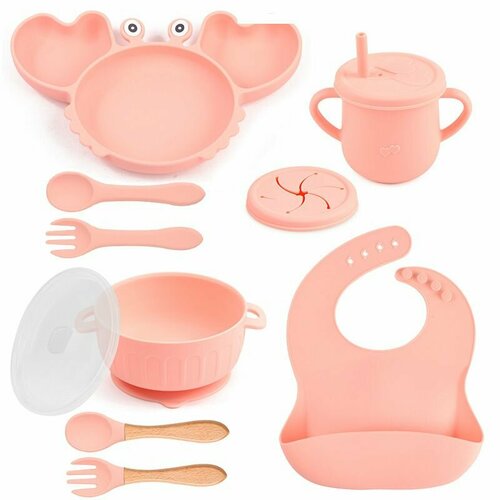 Набор максимальный (9 предметов) силиконовой детской посуды для кормления малыша Крабик