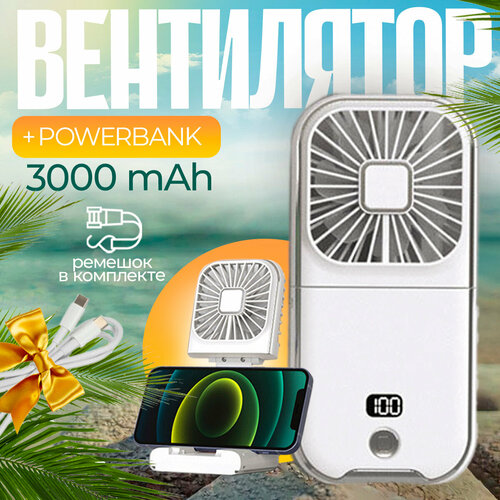 Вентилятор ручной/шейный/настольный с павербанком 3000 mAh портативный беспроводной (c подставкой под iPhone/Android) Powerbank (White)