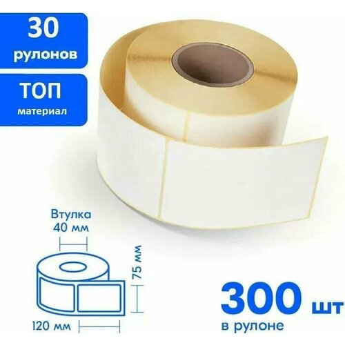Термоэтикетка ТОП, 75 х 120 мм, 30 рулонов по 300 этикеток (9000 шт в комплекте), втулка 40 мм