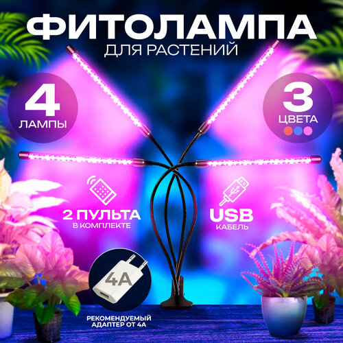 Фитолампа мощная для рассады (4 лампы по 10W), фитосветильник для растений, светильник полного спектра на прищепке (с двумя пультами и USB кабелем)