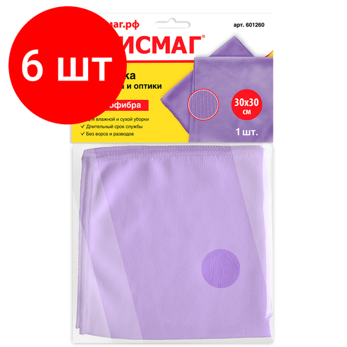 Комплект 6 шт, Салфетка для стекла и оптики, микрофибра, 30х30 см, фиолетовая, офисмаг, 601260