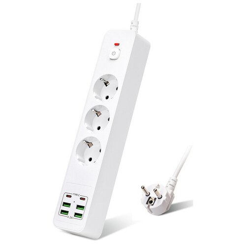 Удлинитель бытовой OFOPRO, сетевой фильтр, 3 гнезда-розетки, 4 USB, 2 USB TYPE C, 2м, 10А/3000Вт