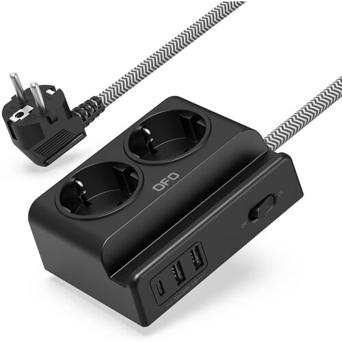 Сетевой фильтр OFOPRO (Чёрный), удлинитель электрический бытовой, 2 гнезда-розетки, с/з, 2 USB, 1 USB TYPE C, 1.5м, 10А/2500Вт
