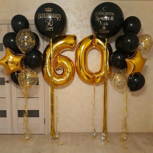 Черно-желтый фонтан со звездой из шаров надутых гелием 15 шаров