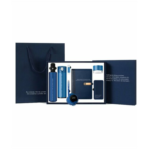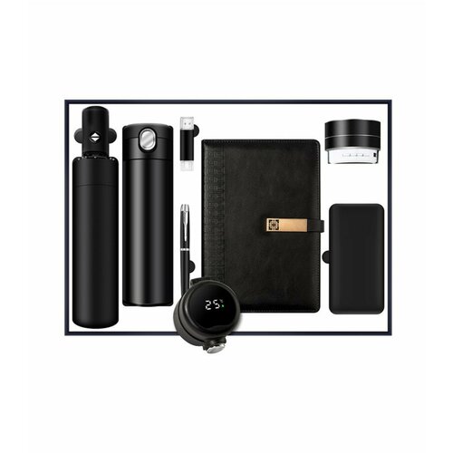 Подарочный бизнес набор : аккумулятор Power Bank + ручка + флешка USB на 8 ГБ + ежедневник А5 + термос из нержавеющей стали + зонт + аудио колонка