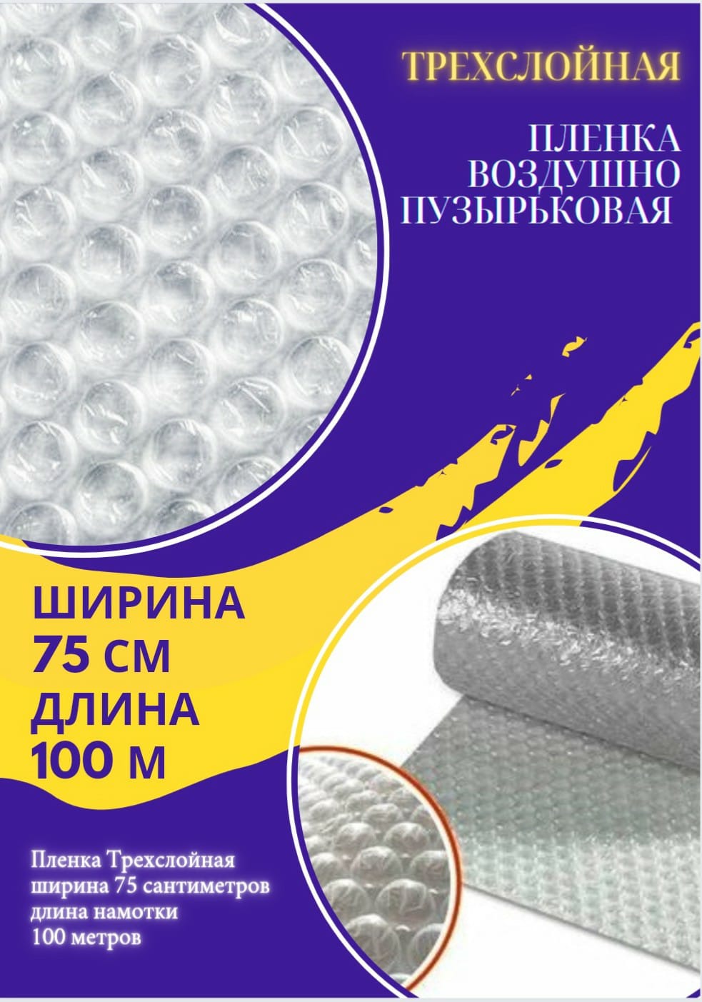 Пленка 0.75-100м Трехслойная воздушно пузырчатая пузырьковая пупырчатая пупырка 75мкр Пленка воздушно пупырчатая