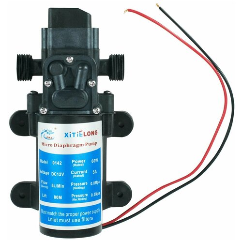 Мембранный насос высокого давления для воды и систем туманообразования, 12 Вольт, 60 Ватт, 5л/мин, подъем воды 80м. Подключение: наружная 1/2" резьба