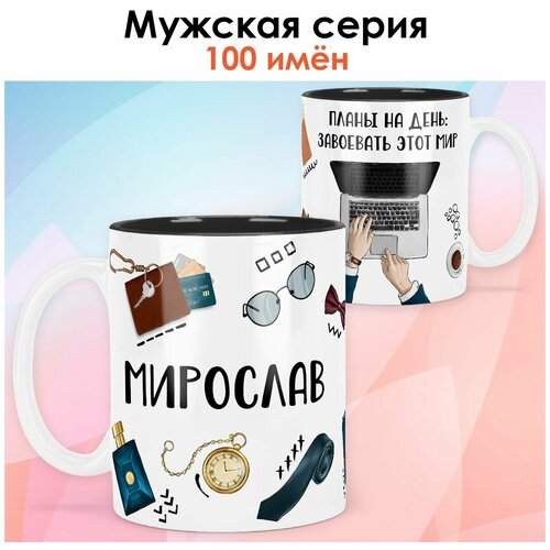 Кружка print LOOK с именем Мирослав "Планы на день" Мужская серия - белая ручка чёрная внутри