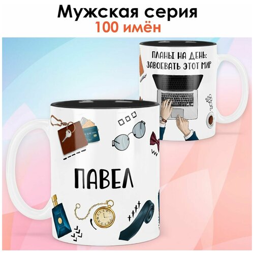 Кружка print LOOK с именем Павел "Планы на день" Мужская серия - белая ручка чёрная внутри