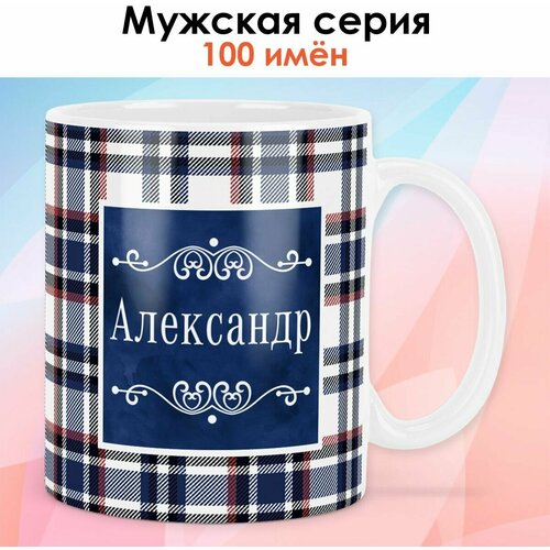 Кружка print LOOK с именем Александр "Синяя клетка" Мужская серия - белая основа