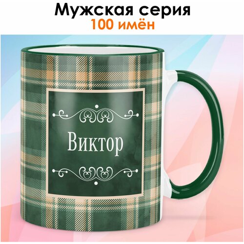 Кружка print LOOK с именем Виктор "Зелёная клетка" Мужская серия - зелёная ручка и ободок