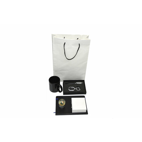 Подарочный набор в одном цвете "Черный" 8 предметов, пакет, ежедневник, шарик с блёстками, бумага для заметок, кружка, авторучка, брелок и футляр