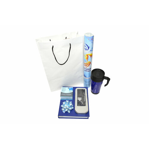 Подарочный набор в одном цвете Синий. 8 предметов. Хлопушка, тетрадь со сменными блоками, авторучка, брелок, футляр, блок для записей, бантик и термокружка