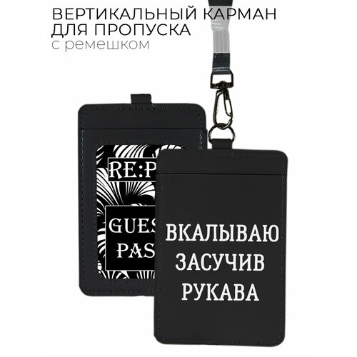 Чехол (бейдж) для пропуска и карт на ленте с принтом "Работаю засучив рукава!" черный