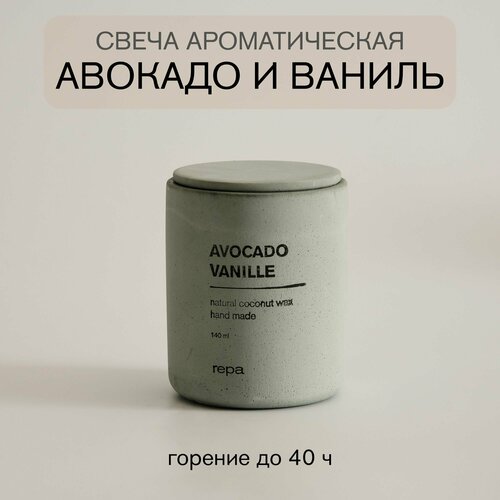 Свеча ароматическая с крышкой repa home decor "Авокадо и Ваниль - Кокосовая свеча" в стакане из гипса с хлопковым фитилём, 30 часов горения, 8,2 см х 6,5 см