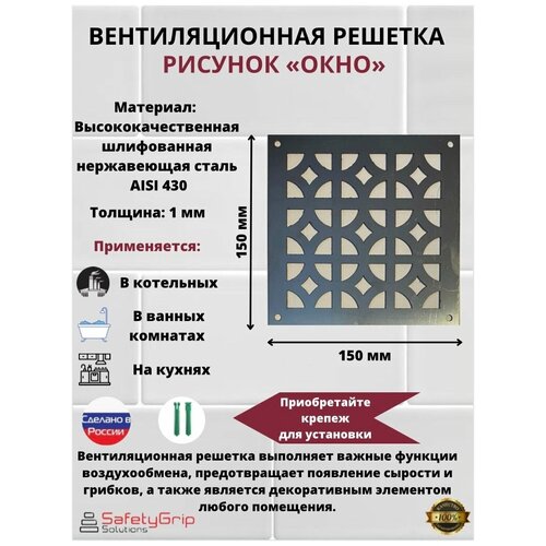 Решетка для трапа 150 мм х 150 мм из нержавеющей стали, шлифованная, рисунок "Окно", решетка вентиляционная из нержавеющей стали, 15 см х 15 см, 1 штука