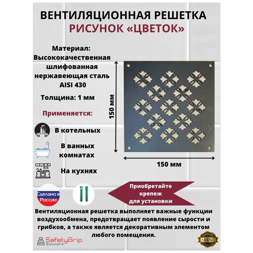 Решетка для трапа 150 мм х 150 мм из нержавеющей стали, шлифованная, рисунок "Цветок", решетка вентиляционная из нержавеющей стали, 15 см х 15 см, 1 штука