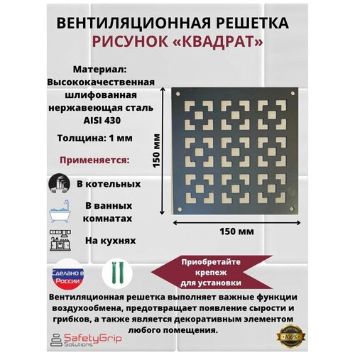 Решетка для трапа 150 мм х 150 мм из нержавеющей стали, шлифованная, рисунок "Квадрат", решетка вентиляционная из нержавеющей стали, 15 см х 15 см, 1 штука