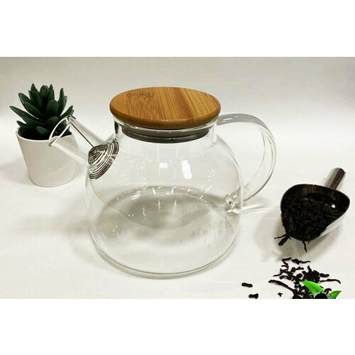 Чайник заварочный из стекла с бамбуковой крышкой из прочного и толстого жаростойкого стекла 600 мл