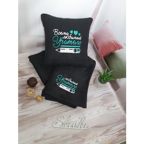 Подарочный набор "Всеми любимый учитель" : декоративная подушка 30х30 см и плед 150х150 см с машинной вышивкой