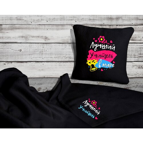 Подарочный набор "Самый лучший учитель" : декоративная подушка 30х30 см и плед 150х150 см с машинной вышивкой
