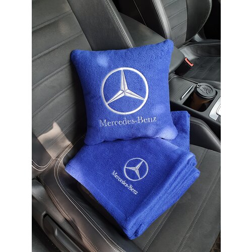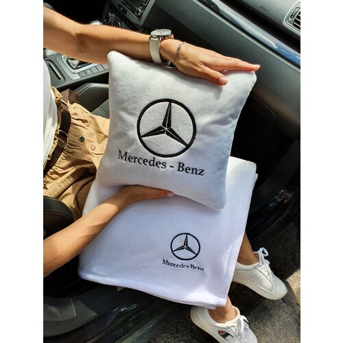 Автомобильная подушка 30х30см и плед 150х150 см в машину с вышивкой логотипа "Mercedes - Benz"
