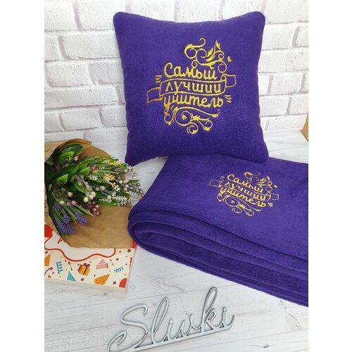 Подарочный набор "Самый лучший учитель" : декоративная подушка 30х30 см и плед 150х150 см с машинной вышивкой , цвет фиолетовый
