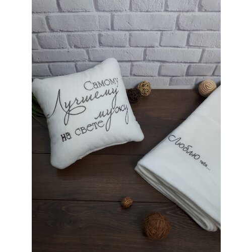 Подарочный набор "С добрым утром, Любимый" : декоративная подушка 30х30 см и плед 150х150 см с машинной вышивкой