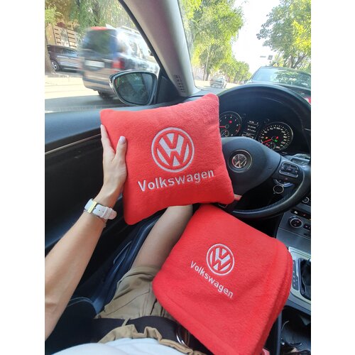 Автомобильная подушка 30х30см и плед 150х150 см в машину с вышивкой логотипа Volkswagen, цвет красный
