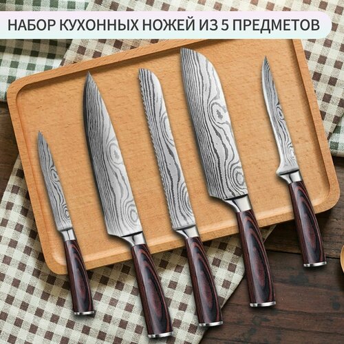 Набор кухонных ножей Кухонный нож универсальный 5 ножей(Красный паккавуд) русский