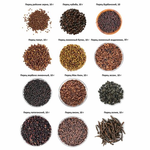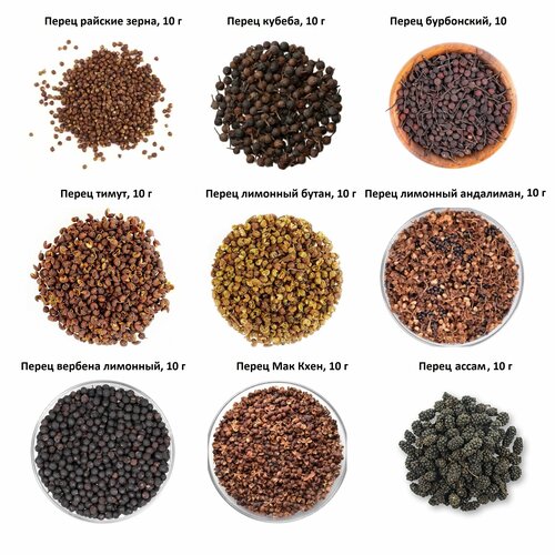 Набор экзотических перцев - райские зерна, бурбонский, кубеба, лимонный бутан, тимут, ассам, длинный, сычуаньский