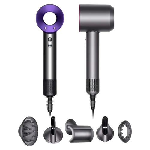 Фен для волос профессиональный/ Супер фен для укладки волос/ 5 магнитных насадок/ ионизация/ Silver/ Purple