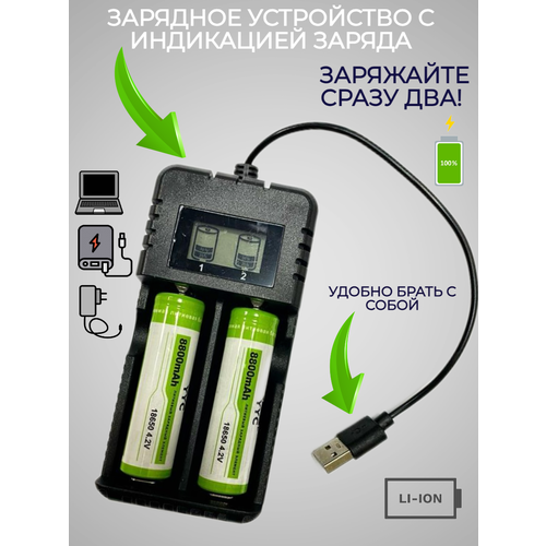 Зарядное устройство с USB портом с 2 слотами для Li-ion АКБ типа 26650, 18650, 16340, ААА, АА