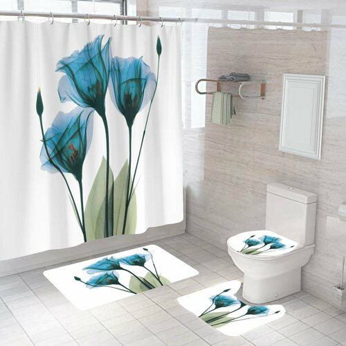 Набор для ванной комнаты 4 в 1 , коврик для ванной, коврик для туалета, накладка на унитаз, шторка в ванную 180 на 180 см синие цветы