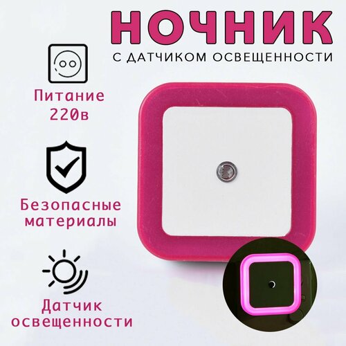 Светодиодный ночник для сна с автовыключением. Детский, с датчиком света в розетку. Работает от датчика освещённости. Розовое свечение