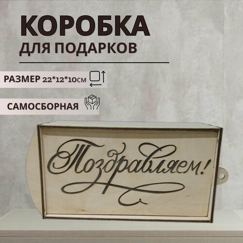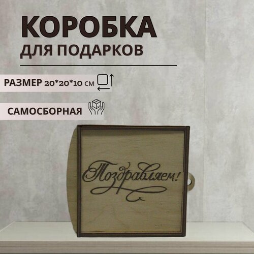 Подарочная коробка из дерева с надписью "Поздравляем" с наполнителем, размер 20*20*10 см