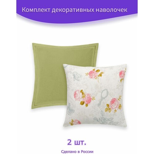 Комплект наволочек - чехлы для декоративной подушки на молнии 45 х 45 см. - 2 шт, белый, светло-зеленый, розовые розы