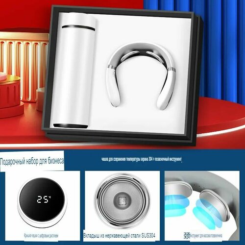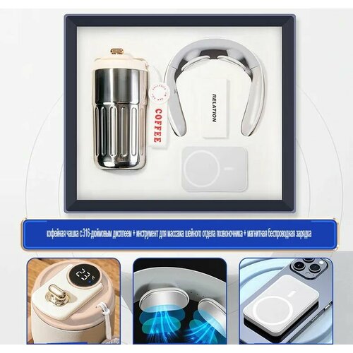 Набор кружка-термос, шейный массажер и беспроводная зарядка для телефона.