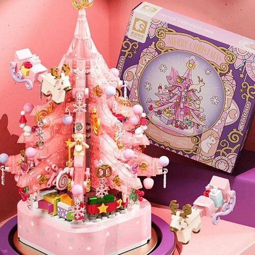 Детский развивающий конструктор блочный " Новогодняя елка - музыкальная шкатулка" - 729 деталей Розовая
